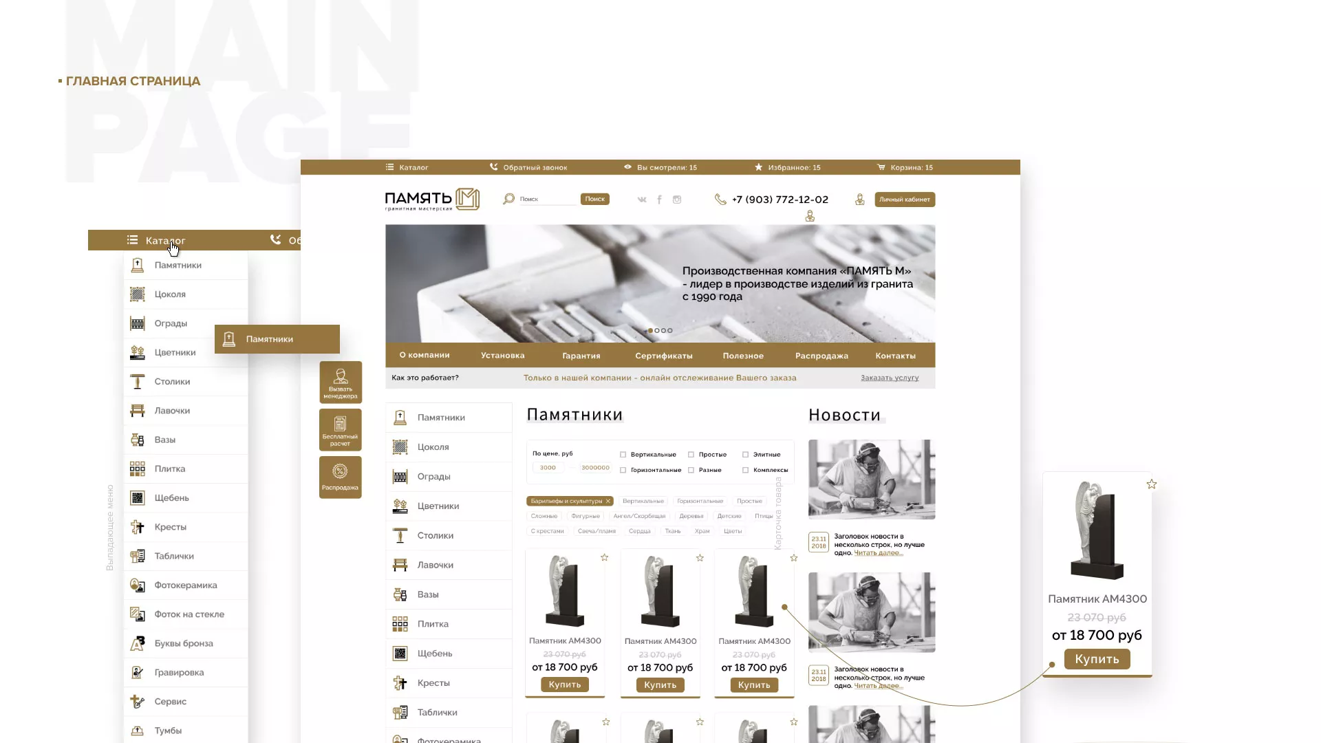 Разработка логотипа, фирменного стиля и сайта в Избербаше для компании «Память-М». Компания является предприятием по изготовлению всех видов надгробных сооружений: памятников, цоколей на могилу, оградок, столов, лавочек, ваз, балясин, плитки, мемориальных комплексов. Компании «Память-М» изготавливает все виды мемориальных изделий на собственном производстве в Избербаше.